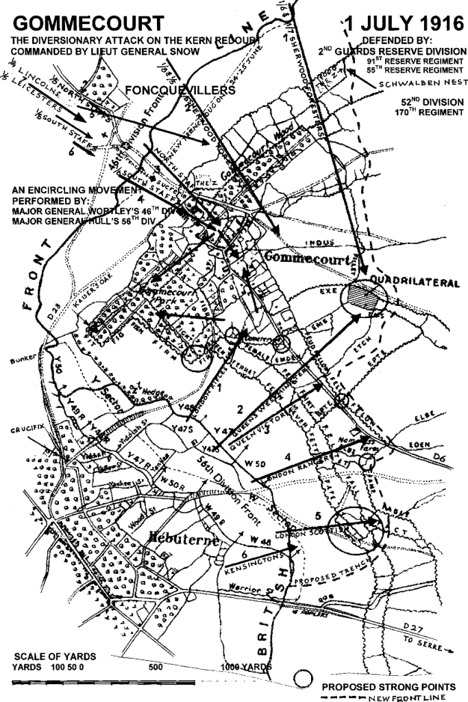 This was going to be a hard nut to crack. When General Haig planned this battle he wondered how he could give the attack a better chance! Whilst he considered this he told the commanders of his First, Second, and Third Armies to carry out constant threatening moves – to keep the German troops on their toes. Like all good commanders he consulted his Intelligence section and took soundings from his staff. He came up with a diversionary movement. This was not a new idea as all commanders considered one, placing them at a distance from the main attack – the flanks being an ideal place. On Haig’s left was a salient sticking out of the German line. This was a continuing sore which would be the perfect place. Gommecourt, for that was the name of the salient would be ideal. As he could not take any forces away from General Rawlinson he contacted General Allenby – Commander of his Third Army – to request a corps transfer. Allenby chose the 46th and 56th Territorial Divisions. Their task was to mount a full-scale attack on Gommecourt. The object: remove the salient if possible, but more importantly, cause a diversion – to stop German reinforcements backing up their troops opposite the main British thrust – which was to be an advance up the main road from Albert towards Bapaume. This main force was Lt-General Rawlinson’s Fourth Army, backed up and supported by Lt-General Gough’s Reserve Army, who were hoping to break out – into the country beyond. Neither Allenby nor Rawlinson liked the plan because there was a gap between their Army and Rawlinson’s Fourth – leaving no protection to the right flank of the attacking force – between Gommecourt and Serre – the preserves of Hunter Western’ 8th Corps.  Behind Gommecourt – to the north, was the Quadrilateral, a defensive position surrounded by tracks. Southwest lay the village: the high street, crossroads, chateau, park, wood, orchards, and cemetery. By the time of the battle there were three lines of German trenches and interlocking communication trenches, plus their dug-outs and fortified posts. The whole lot constituted The Kern Redoubt. From the centre of the main British attack at Albert, Gommecourt is some ten miles to the north. All the villages, through which the German front line ran, were turned into fortified strong-points. The Kern Redoubt was one, if not the main defence system in the line and as such was going to be an extremely hard nut to crack. This was not obvious to the casual observer, for all the main troop locations were underground with passageways leading to specific locations and key outer defences. The machine gun nests were camouflaged; some with top cover others in strategic positions dictated by the attackers approach. The German defending artillery was used for counter battery and bombardment and was hidden by a number of woods. In front of the firing line was staked barbed wire strung to a minimum depth of ten feet. Both the little Z – a zig-zag on the eastern flank, and the Z just before the village – a finger of park jutting out on the centre, allowed machine gun fire to enfilade the Sherwood’s attacking the wood. Lieutenant General Sir Thomas D’Oyly Snow KCB, KCMG was born in Newton Valence. He attended Eton and St John’s College, Oxford, obtaining a commission in 1879. Promoted Captain 1887, took part in the wars in Africa reaching staff rank in 1897. At the outbreak of the 1st World War he commanded the 4th Division finally becoming commander VII Corps on 15th July 1915. His force at Gommecourt comprised the 46th North Midland and 56th London Divisions. It was Snow’s plan and his alone, to create a pincer movement around the strongly held Gommecourt Park – the tip of the German salient. He had however, no freedom of action – about the numbers of artillery pieces he could muster, the type, or numbers of shells allowed for each gun, or the timing of his attack… for these had to conform to the main battle plan devised by his senior commander – General Rawlinson. The division’s main aim was to draw German attention away from the main battle area – keep him occupied. Whereas, Snow’s plan smacks of ‘a positive aggressive action’ – to encircle, crush, and take. If he had planned a single push using all his forces, on the weakest part of the German front line – somewhere where they could not be shot at by machine gun fire, whilst making his flanks secure his action would have had – a far greater effect. A narrow front allowed a greater concentration of fire – on batteries on the front and in the rear. The then current General Staff instructions were: that no attack should be made: when having to advance more than 200 yards from the enemy. Snow stressed before the battle – to his two divisional commanders: ‘this is a diversion to support the main battle, your role is a strictly limited one; there are no reserves, and your attack should only take place when the German defences have been destroyed by the artillery’. These limiting factors are restrictive and important guidelines. They indicate that there was no strategic point in the attack, and that success depended on a single outcome – the full engagement and occupation of the Germans. During the attack all Rawlinson’s limiters would need verification – checked by a trustworthy officer who would then report back. Presumably General Rawlinson received this? There are no references to an on the spot examination, nor who was to make the decision, or by what means the information was to be carried back to those in charge. Only the commanding officer at the front can decide if the German defences have been destroyed sufficiently to be sure any attack would be successful. If he cannot be certain by personal knowledge he needs good, reliable information passed to him. On the day neither of these instructions were carried out. Within the first few minutes it was clear the German defences had not been de